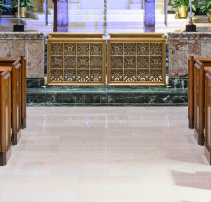 The nave is the central gathering place for worshippers, designed for prayer, worship services, and Catholic Mass. It features a floor made of gray marble from Tennessee and accents of dark green marble quarried in Vermont.